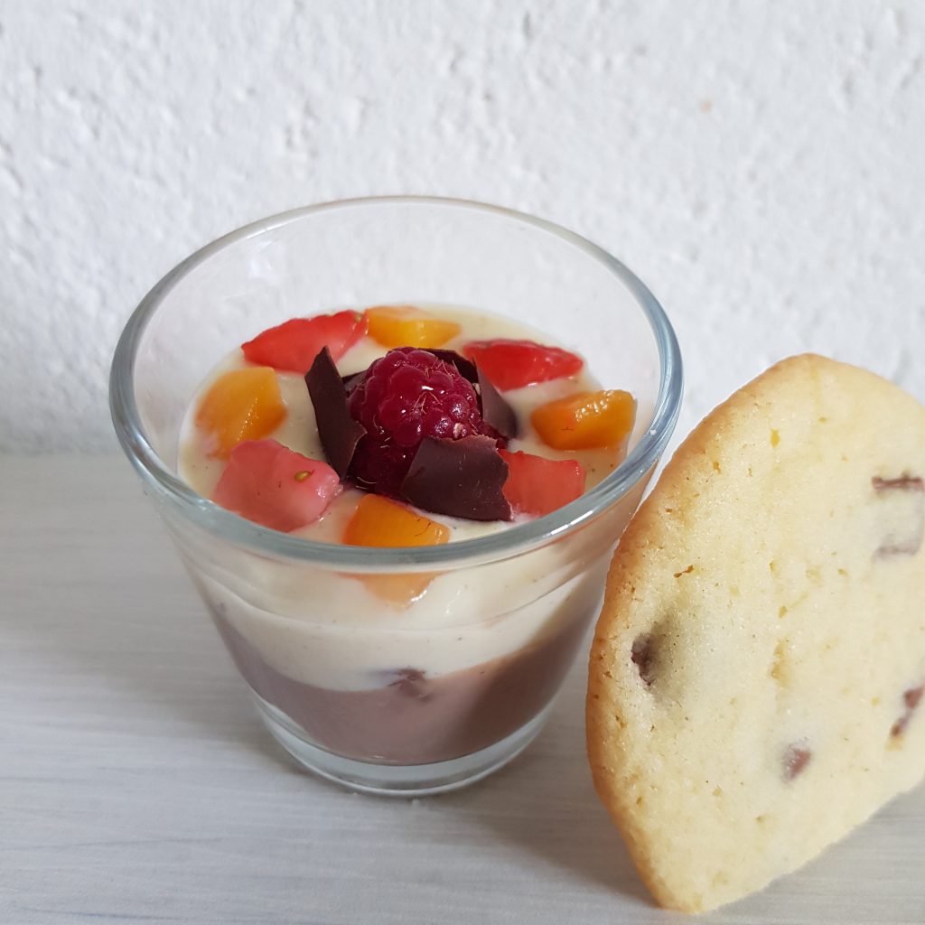Heute habe ich ein Dessert kreiert mit homemade Cookies, selbstgemachter Schokolade- und Vanillecreme und Früchten.